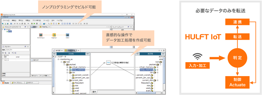 エッジデバイス上でのデータのファイリング、変換、加工をノンプログラミングで実現します。
