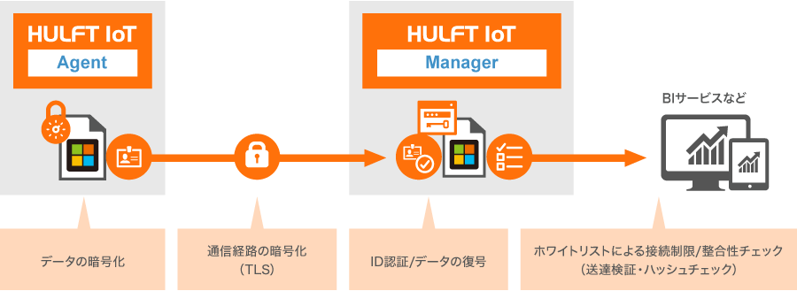 独自のID認証やホワイトリストによる接続制限でなりすましを防止し、データおよび通信経路の暗号化、整合性チェックで、データの盗聴・改ざんを防止します。