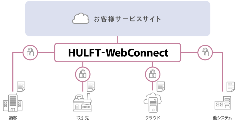 「HULFT-WebConnect」は、HULFTのファイル転送をインターネット経由で行うことができるSaaS型データ中継サービスです。インターネットに接続できる環境があれば利用できるので、低コスト・短期間でのサービス立ち上げを実現しビジネス拡大に貢献します。セキュリティ対策も万全で、お客様のサービスと顧客の環境を簡単に連携させることできるため、顧客からのデータ収集、顧客へのデータ送信といったシーンにも最適なデータ中継サービスです。