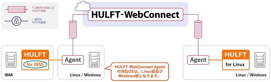 HULFT-WebConnect Agent の対応OSはWindows/Linuxのみのため、HULFT for IBMiでHULFT-WebConnectのHULFT転送を利用する場合は、 別途、 HULFT-WebConnect Agent を導入するサーバ(Windows/Linux)が必要となります。また、 HULFT8 for IBMi のバージョンが V8.4.2 以降、HULFT-WebConnect Agent のバージョンが V2.3.1 以降からの対応となります。