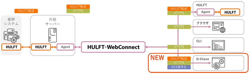 新バージョンでは、従来機能の企業間や拠点間のHULFT同士のファイル連携をインターネット経由で連携できる機能に加え、企業規模を問わず多数の取引先とのHULFTを利用したファイル連携の利用が可能になるファイル転送クライアント「D-Client」を提供開始しました。