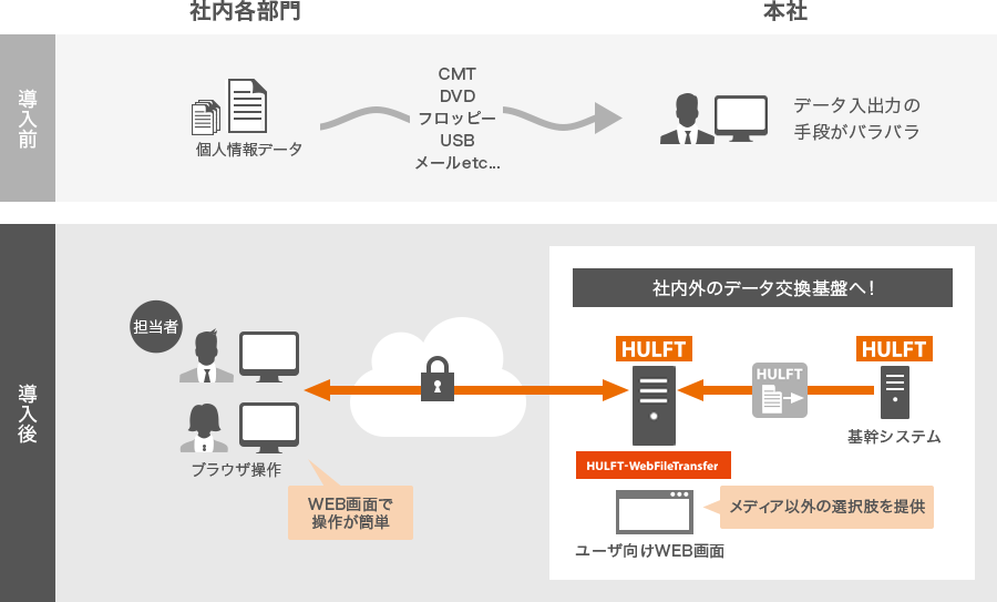 煩雑だったメディアを介したデータ入出力がブラウザ操作に一元化され、コンプライアンス強化と業務効率化を実現。