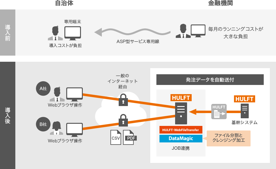 基幹システムで生成された発注データを「HULFT-WebFileTransfer」へ自動アップロード。人手を介さず取引先との発注の自動化によりコスト低減。