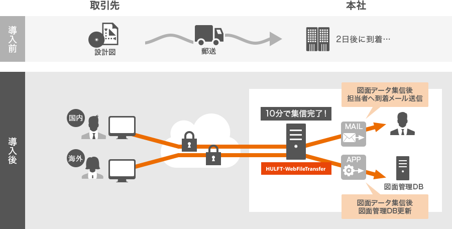 担当者へのメール通知と図面管理DBへの自動保存が可能になり運送費、作業負荷を軽減。