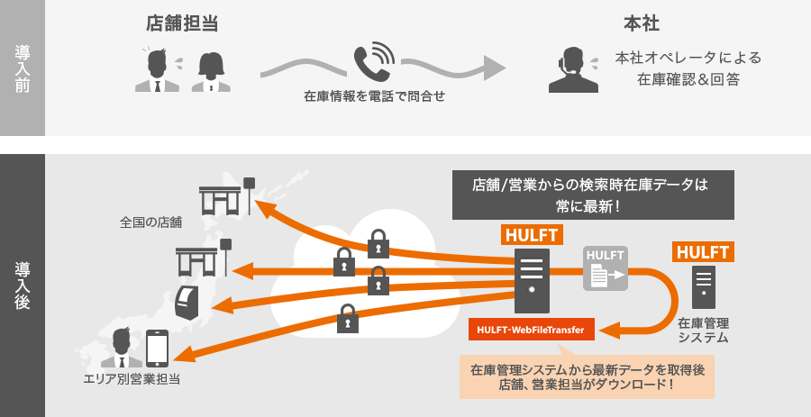 全国の店舗やエリア別営業担当が入手する在庫データが常に最新になり、本社オペレータの負荷が軽減、在庫情報の精度が向上。