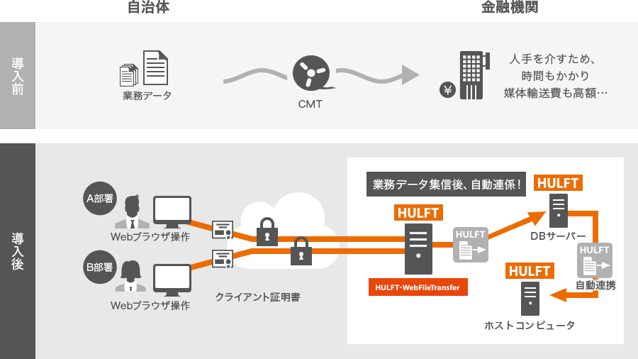 販売停止となったCMTの代替として、「HULFT-WebFileTransfer」に移行。 輸送費と運用コスト削減に成功。