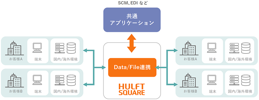 HULFT Square とお客様の環境を HULFT でファイル連携できます。サーバーやプラットフォーム、コード体系などが異なる様々なファイルを、業界標準のTCP/IPプロトコルを使って安全、確実に送り届けます。