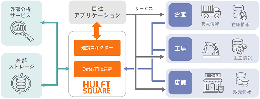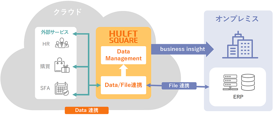 HULFT Squareは、DX実現に必要な「データ活用するためのデータ準備」や「業務システムをつなぐデータ連携」を支援する日本発のiPaaS(クラウド型データ連携プラットフォーム)です。オンプレミス・クラウド・SaaSなどの環境に分散し管理されているさまざまなデータを、業務システム間、業種、国・地域をまたぎデータ連携させることができます。