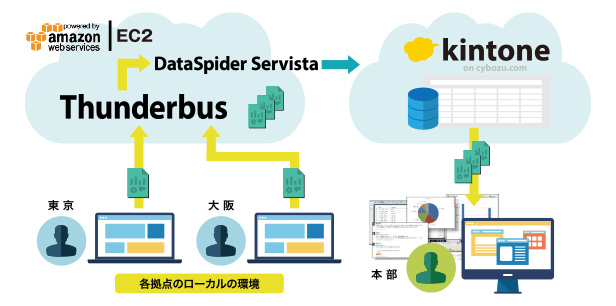 店舗側では使い慣れたExcelにデータを入力し、今まで通りローカル環境に保存するだけ。ThunderbusがExcelのデータを本社のkintoneにつないで最新のデータを自動登録します。