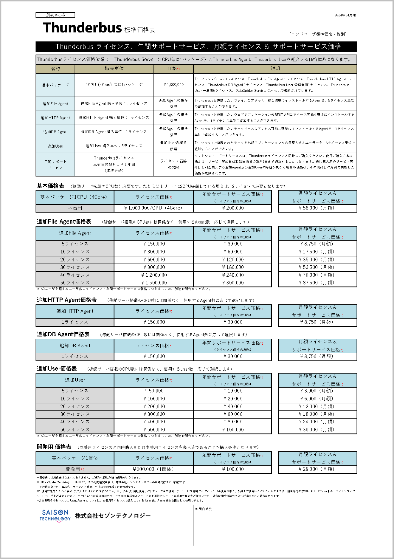 Thunderbus 製品 | ライセンス価格 | 年間サポートサービス価格 (ライセンス価格の20%) |