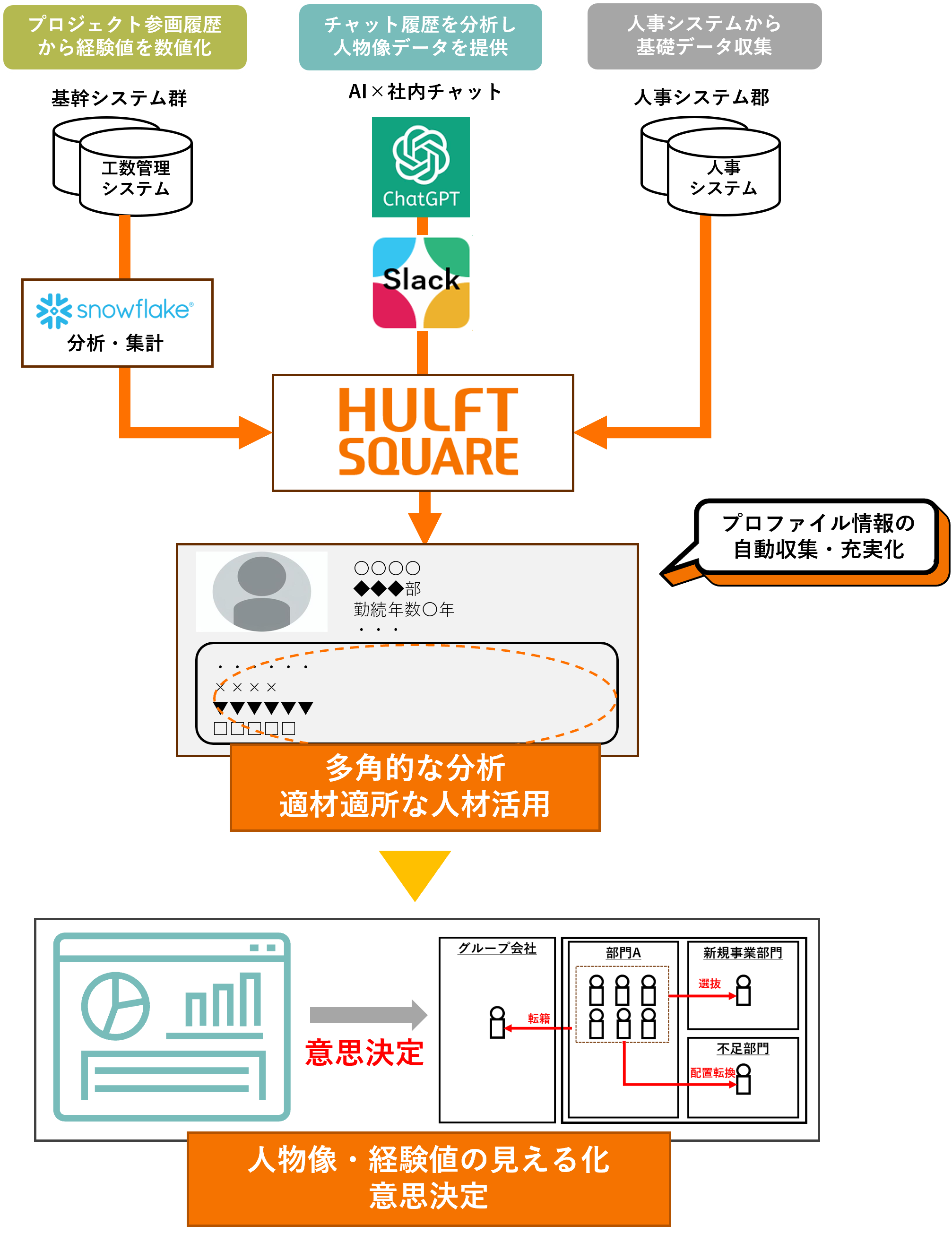 クラウド型データ連携プラットフォームのHULFT Squareを活用すれば、「チャット履歴×プロジェクト参画履歴」のデータ活用が可能です。