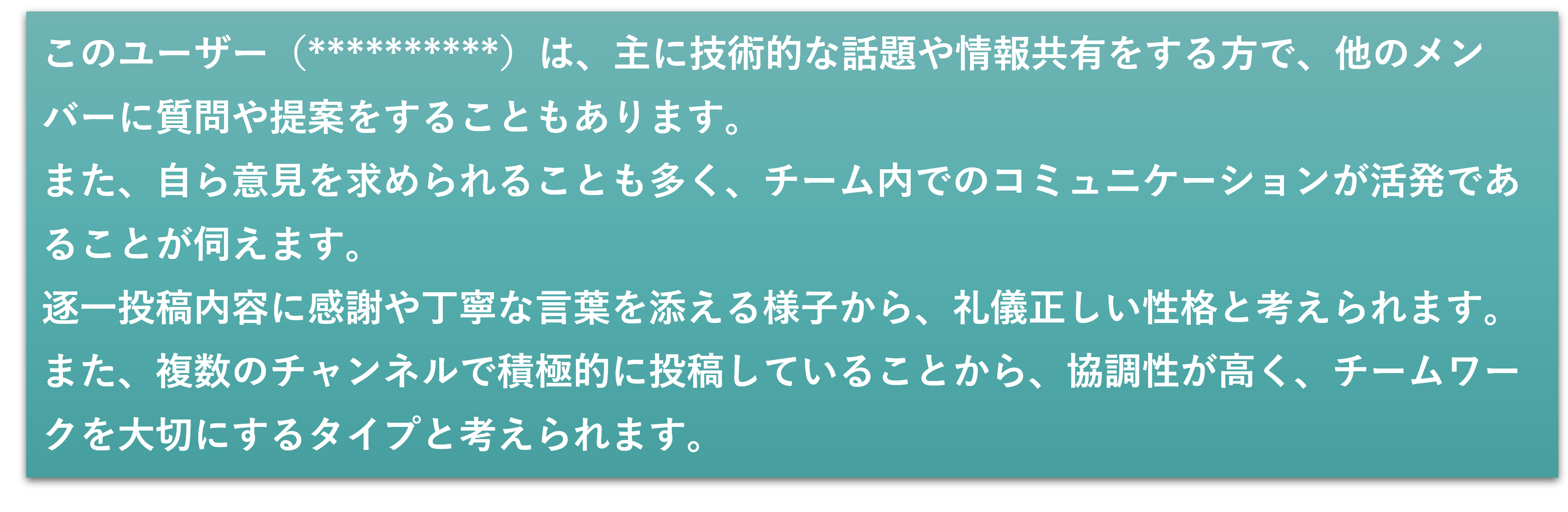 人事システムにあるデータからは見えにくいその人の人柄や興味・関心情報を、Slackの会話履歴をChatGPTによって分析し、性格や人柄情報を提供します。