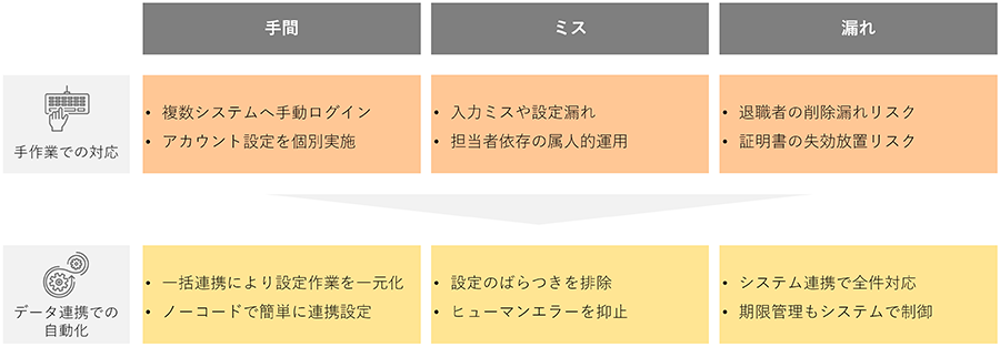 例えば、1人の社員に対して10以上のサービスにログインし、個別にアカウント設定や権限付与をする必要があることも。また、PCやモバイル端末へのデバイス証明書の発行作業も、手動で行うと多くの時間と労力を必要とします。これにより、作業は煩雑化し、情報の食い違いや対応漏れといったリスクも避けられません。