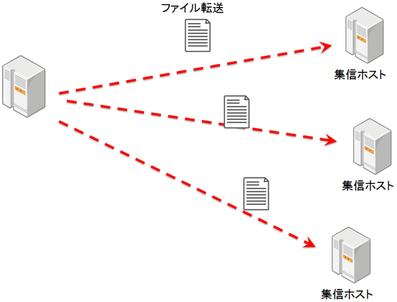たとえば、図1のように1台の配信ホストが3台の集信ホストに対してファイル転送を行う場合を考えてみましょう。