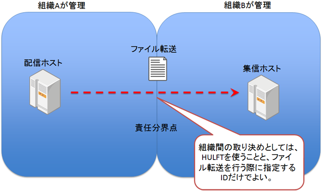 HULFTでのファイル転送では、相手側で行われる処理に依存せずに、自分のホストにおけるジョブのみに責任を持てば良いため、ファイル転送を行う際の責任分界点が明確になります。