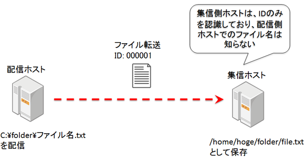 HULFTでのファイル転送は、配信側のファイルシステムで使われているファイル名ではなく、IDと、そのIDが示すファイルのデータを転送することで実現されます。