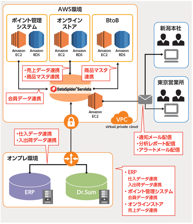 アウトドア用品メーカーのスノーピークのオンラインストアでは、当初はハウジングを利用して自前でオンラインストアの構築、運営を行ってきましたが、今ではAWS上にオンラインストアを展開し、ポイント管理システムや商品発注システムはすべてパブリッククラウドで運用しています。ただし商品の在庫管理や生産状況を把握するための生産管理システムはオンプレミス環境にあるERPを使用しており、AWS上のオンラインストアに対して出荷状況や生産在庫の通知を行うなど、クラウド環境とオンプレミス環境とのデータ連携を行っています。