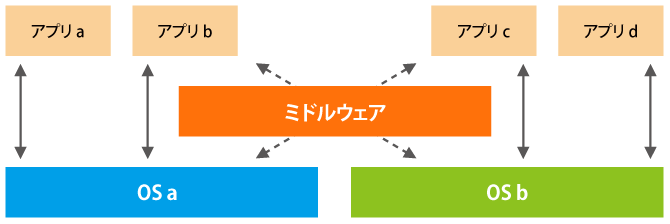 「ミドルウェア」の中には、複数のOSやハードウェアに対応していて、アプリケーションが、OSの違いなどを気にしなくてもいいように設計されているものも多く存在しています。