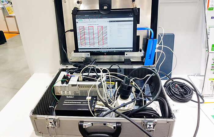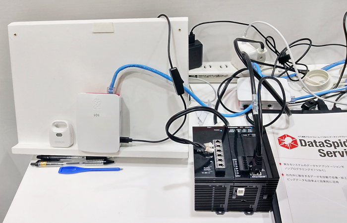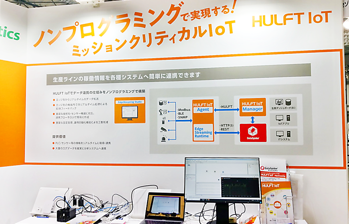 展示ブースではPLCに接続された各種センサの情報を、PLCを経由して「HULFT IoT」が読み出して処理を行い、クラウド等に送信して「見える化」するまでの処理を、ソースコードを書くことなくGUIだけで開発できることを紹介するデモを実施しました。