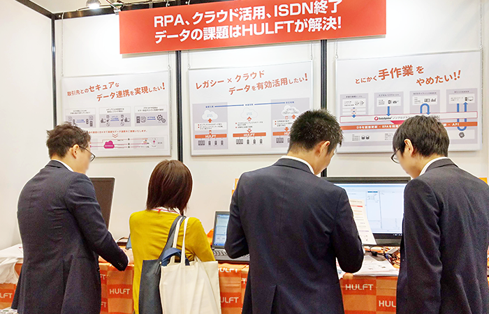 展示会の性質上、ご来場いただく方々は基本的に金融機関の方々です。そこで現在、金融機関が抱える課題について、弊社製品の「HULFT」「DataSpider」により解決できることを意識して、展示および紹介をさせていただきました。