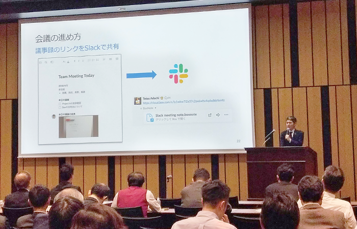 Box上で事前に資料共有などを行って準備、議事録もBox上で共同編集機能を用いて作成、議事録はリンクをSlackで共有と、昔ながらの会議よりもはるかに効率的に、Box上で会議の一連の流れが効率的に完結できることが紹介されました。