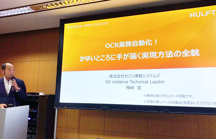展示ブースでの紹介以外にも、弊社で先端技術の調査研究と活用を専門に担っている事業部門である「テクノベーションセンター」の梅崎もセミナーに登壇し、同じくOCR活用での現実的な要点について紹介をさせていただきました。セミナーは事前申し込みだけで満席と、皆さまの関心の高さも再認識させていただきました。