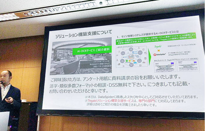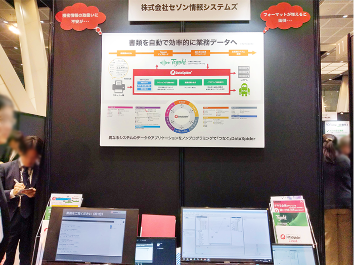 弊社は、手書き帳票を読み取る「Tegaki」と「DataSpider」を組み合わせた、業務効率化ソリューションの紹介など、弊社の「つなぐ」技術による業務効率化について紹介をさせていただきました。今回は展示ブースでのソリューションの紹介に加え、セミナーでの登壇もさせていただきました。