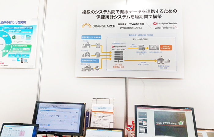 弊社ブースで紹介させていただいたのは、学校におけるデータヘルスの取り組みを支援する、オレンジアーチ社によるデータ活用基盤の構築事例です。弊社の「つなぐ」技術である「DataSpider」を活用いただき、学齢期における健診データを一元化して散在するデータの問題を解決、さらには担当者が自ら政策立案のためのデータ分析作業を行えるようにしたソリューションです。