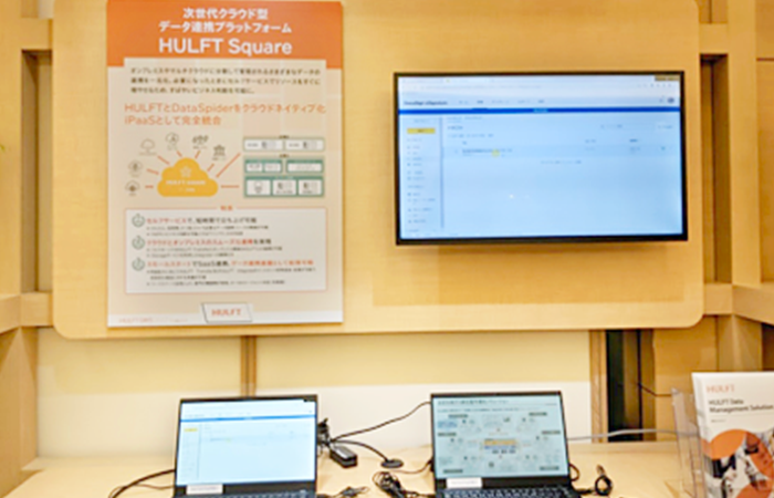 今回、間もなく登場予定の弊社開発運用提供の国産iPaaS「HULFT Square」の展示を、実際の動作デモをお見せすることも含めて行いました。
