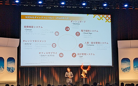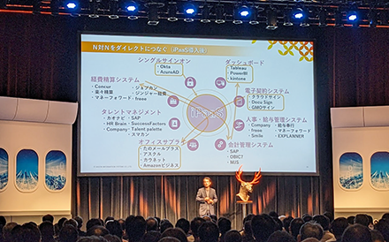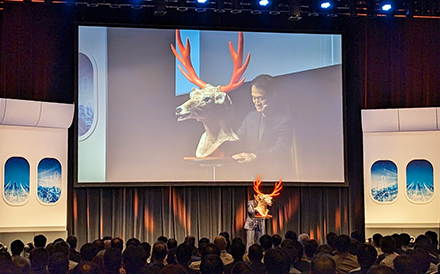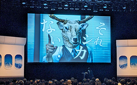 「シカない」が口癖の鹿のキャラクターが出演して、データ連携や「つなぐ」技術の必要性を訴える、HULFT Square のプロモーション動画を紹介させていただきました。動画の再生が終わったあと、弊社の石田が撮影で用いたその「シカの被り物」をもって壇上に登場しました。