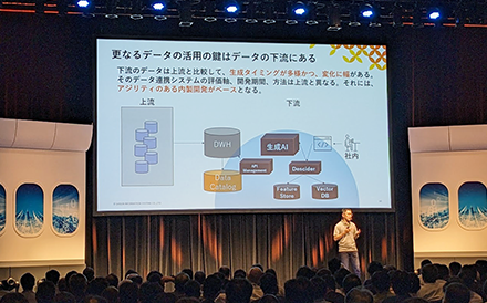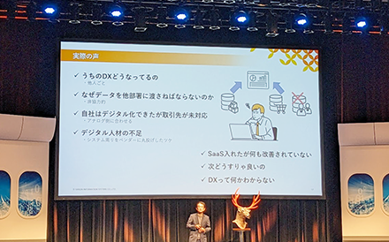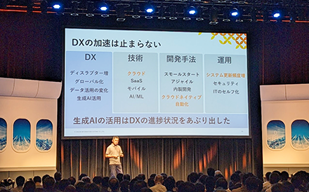次に弊社 CTO の有馬から、生成 AI など最新の話題から今がどうなっているかについて発表がありました。生成 AI も破壊的変化ですが、DX とはデジタルが自分たちのビジネスを破壊的に変革することへの備えのことでもあります。生成 AI がブームになることで、流行語としての DX がかすんできて、そのことにより各社の DX が実際にどれだけ取り組まれているかが見えるようになってきたのではないかとのことでした。