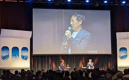 一日目はオフライン会場での開催に加えて、セッション終了後に懇親会を開催しました。会場は今回も豪華に日本橋三井ホールでの開催、司会もフリーアナウンサーの宇賀 なつみさんにお願いいたしました。