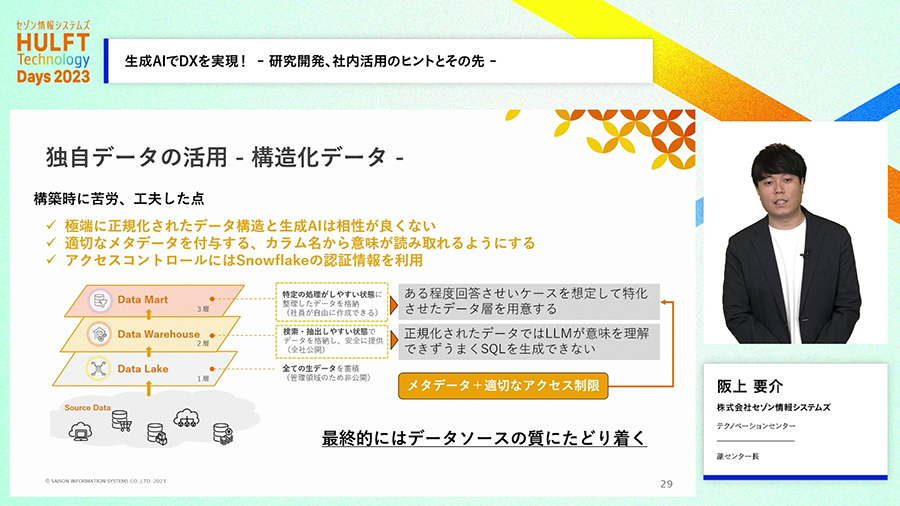 構造化データと非構造化データで違う方法で対応しており、PDFドキュメンドなどの非構造化データについてはAzure上のサービスを用いて参照できるようにしています。DWH上の構造化データについては、様々な正規化がされた構造化データと生成AIの相性が必ずしも良くないこともあり、生成AIに認識させるために用途にあわせてデータマート化してから参照させるなどの工夫を行っています。
