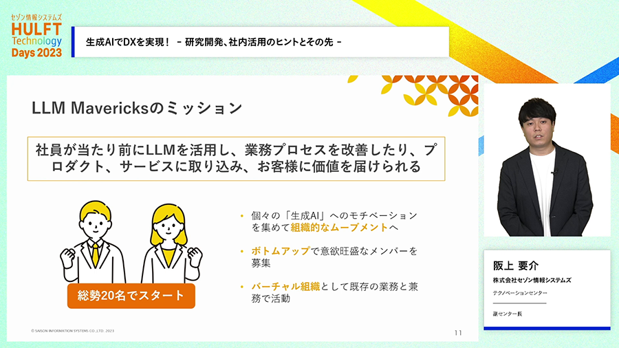 生成AIに関連して、社内のあちこちでそれぞれ独自に取り組みをやろうという動きがありました。大変話題になった技術でもありますし、他社においても社内において興味を持った人や現場で試してみようと思う人が出てきている状況は良くあるのではないかと思います。それら個別の動きを、全社活動として束ねて社としての取り組みとしています。それぞれの現場から参加者を募り、参加者はそれぞれの部門に所属したままで部署横断のバーチャル部門(LLM Mavericksという名前にした)として取り組みを進めています。