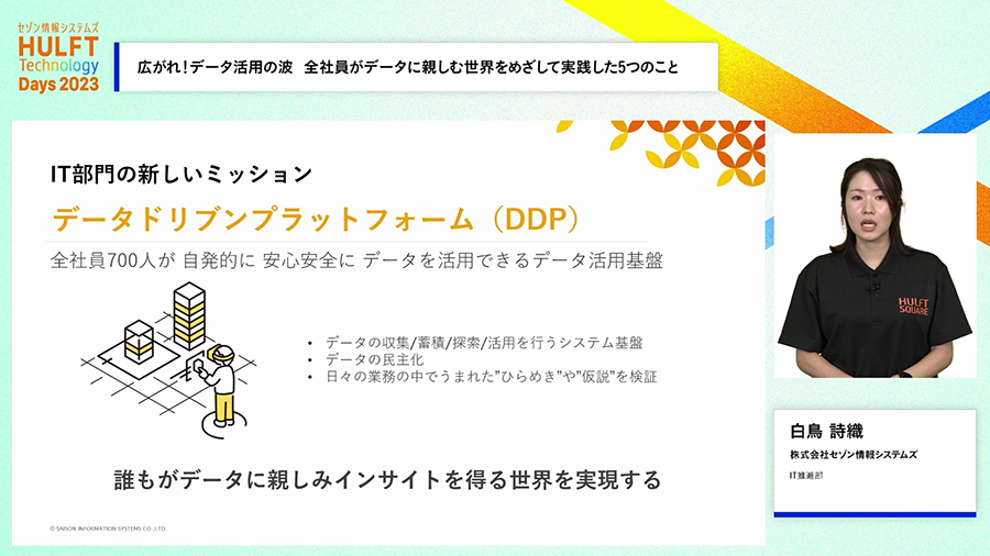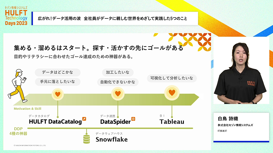 そこで整備したのが、弊社社内でDDP(データドリブンプラットフォーム)と呼ばれている全社データ基盤です。弊社製品ももちろんしっかり活用しており、DWHとしてSnowflakeにデータを溜めており、HULFT DataCatalogで必要なデータを探せるようになっており、データの加工や処理の自動化はDataSpiderで実行可能で、データ分析やレポート作成はTableauで行えるようになっており、社員の誰でも利用でき活用できる基盤を整備しています。