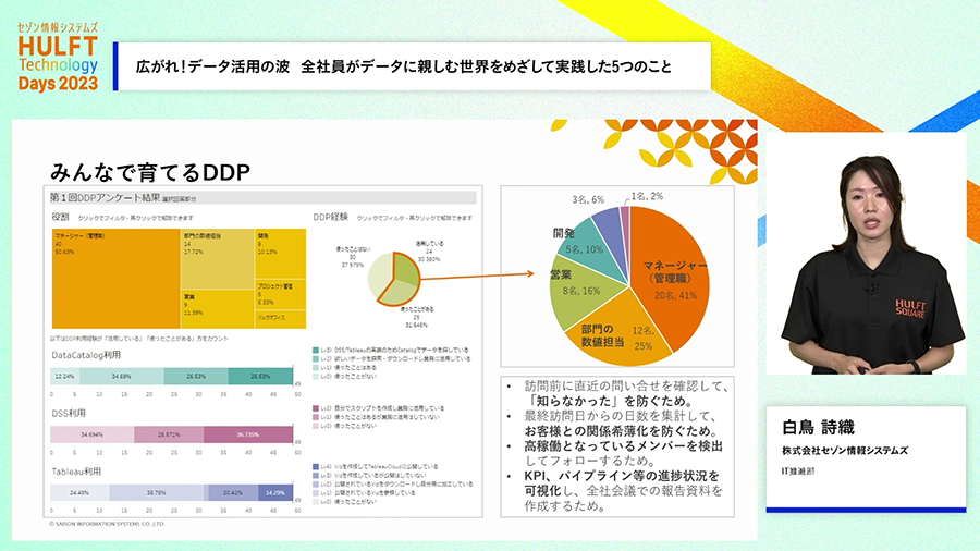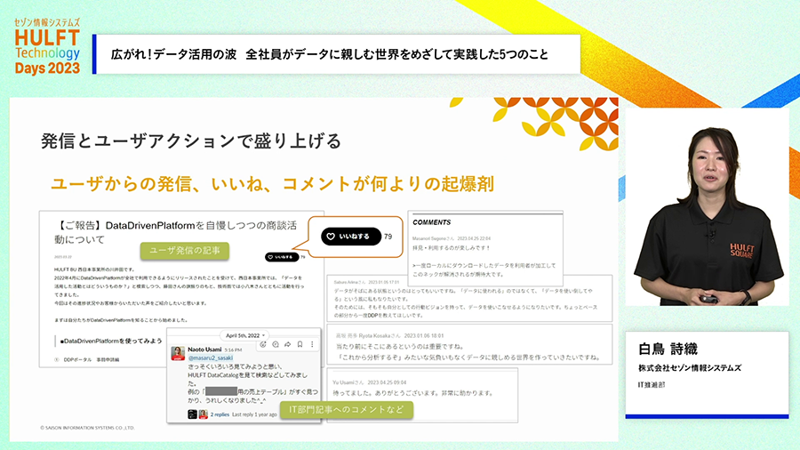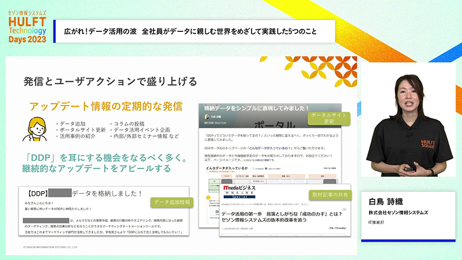 また、データ基盤のアップデートを日々お知らせする、社内での利用者による情報発信を行ってもらうようにするなど、社内での周知活動にも継続して取り組んでいます。機能追加についても利用者のアンケートをとり、アンケートの声を踏まえた機能強化を行うようにしています。