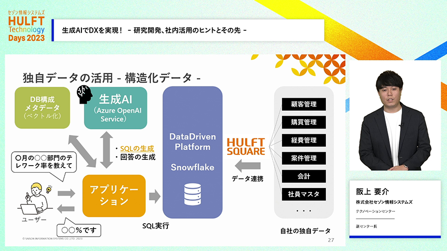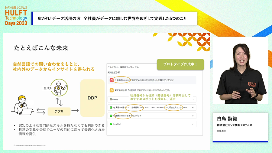 DWHを使って実現している全社データ基盤では、対象となるデータがどこにどういう形で入っているか理解してから検索や集計を行うSQLクエリを作る必要があります。生成AIを活用することで、利用者はDWH上のデータ構造やデータがどこにあるかを気にすることなく利用できる環境の実現に取り組んでいます。利用者は生成AIに欲しい情報を問い合わせるだけで、生成AIがDWHに対して必要なSQL問い合わせを生成し、それを用いて生成AIが回答を作ってくれるような仕組みです。