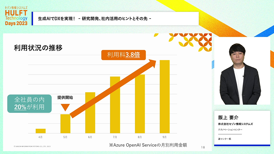 社内の利用は無事にどんどん伸びており、クラウドサービスの従量制の利用料金においても3.8倍となっていて、社内での生成AIの利用拡大に成功しています。