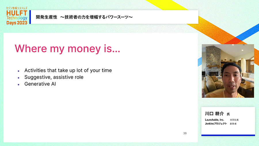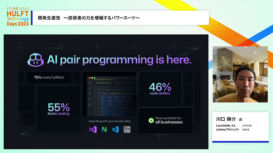 最後にソフトウェア開発におけるAI活用について、どのようなことを期待しているかを伺いました。CopilotのようなAIの支援によるペアプログラミングが効果的であると期待しているそうで、特にジュニアエンジニアの効率化に効果的だと考えているそうです。