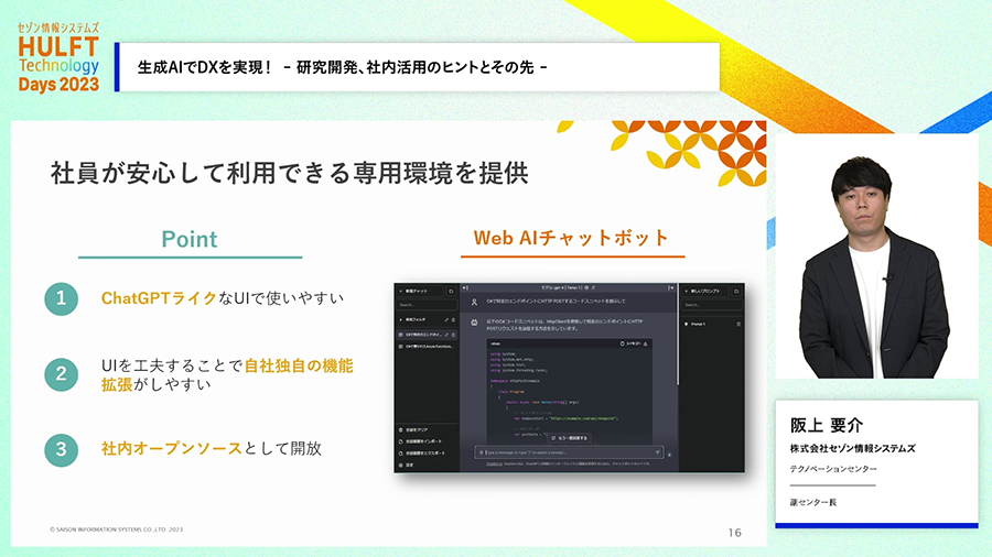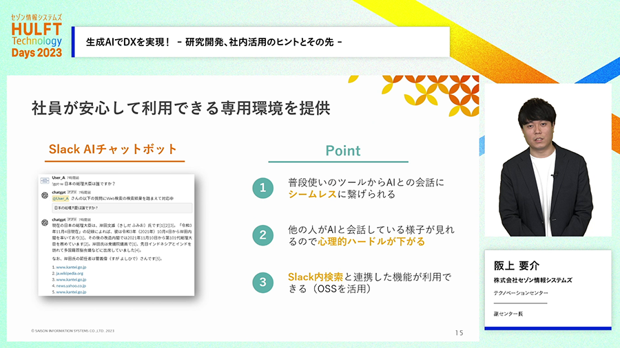 また、全社で生成AI(対話型AI)を活用できるインフラの整備も行いました。社内でのコミュニケーション基盤としてみんなが使い慣れているSlackから利用できるものと、ChatGPTを模したWebUIから利用できる環境が、誰でも利用できるようになっています。