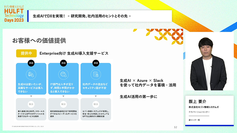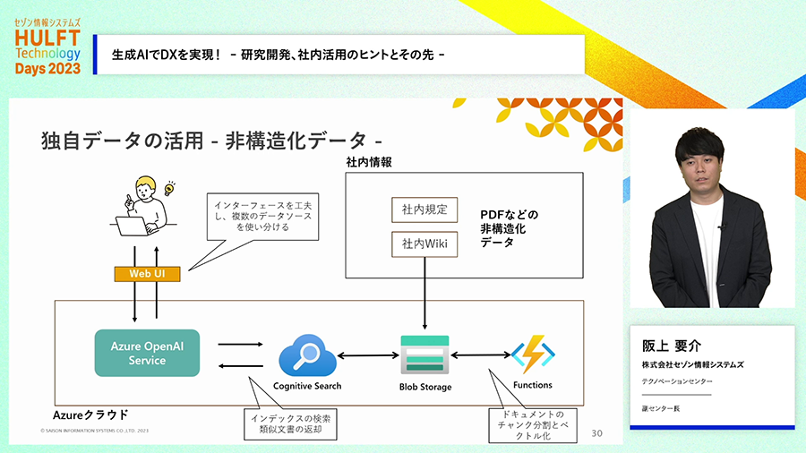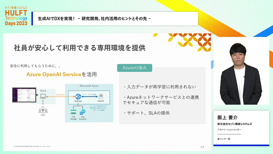 サービスの中身は、Azure OpenAI Serviceを利用しています。入力したデータを再学習に使わないなど法人利用への配慮があること、および既存の整備されたAzureの利用環境をうまく使えることもメリットとして採用しています。