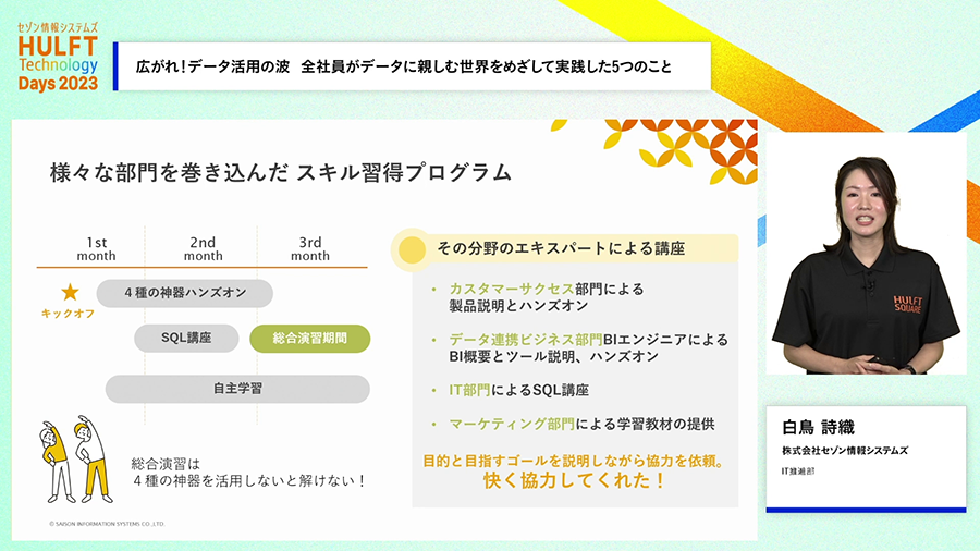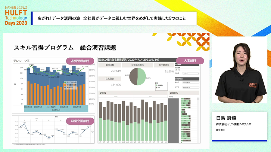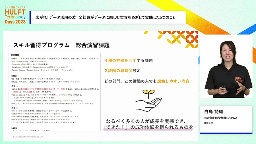 トレーニングプログラムの最後では、教わったことを全部使わないと取り組めない課題を出すようにしていて、それをやってもらうことにより自分自身で使える状態になってもらっています。課題は頑張れば誰にでもできるものと、それができた人にさらに取り組んでもらうものを用意するようにしているそうです。結果、ITスキルと無縁の部門に所属していた人が、本格的な分析作業を日々行うようになるようなことも起こりました。