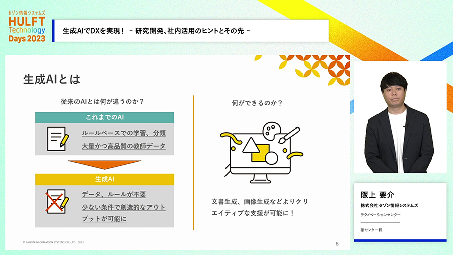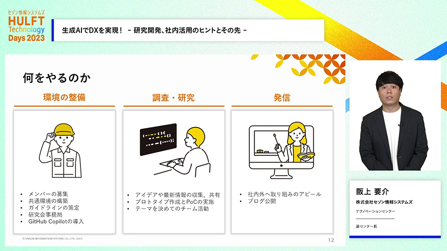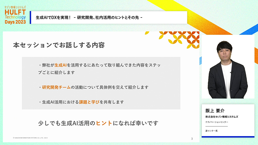 次に、弊社社内での生成AIの取り組みを紹介するセッションです。