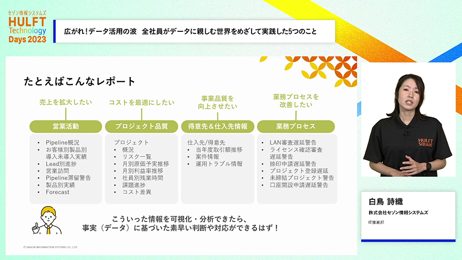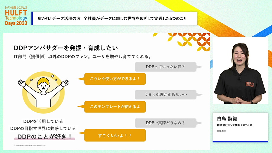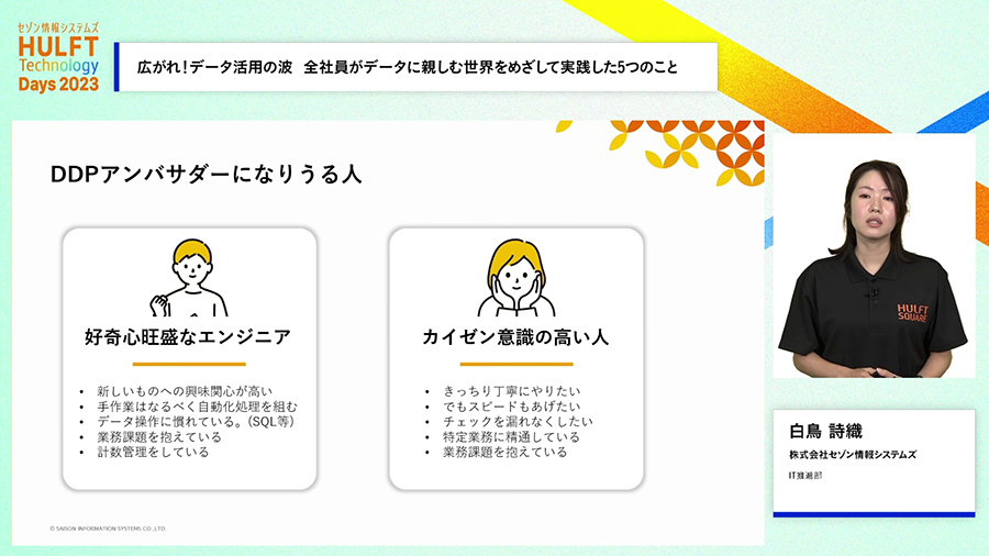 情シスだけで社内全体にきめ細かく対応することは工数的に難しいこともありますし、各部門の業務はそれぞれの部門自身の方が理解しています。そこで、各部門でデータ活用に協力してくれるアンバサダーを育成する取り組みに力を注いでいます。アンバサダーになってくれる人には、新しい取り組みへの好奇心旺盛なエンジニアや、ビジネス上の課題を解決改善したいと思っている人が多いそうです。