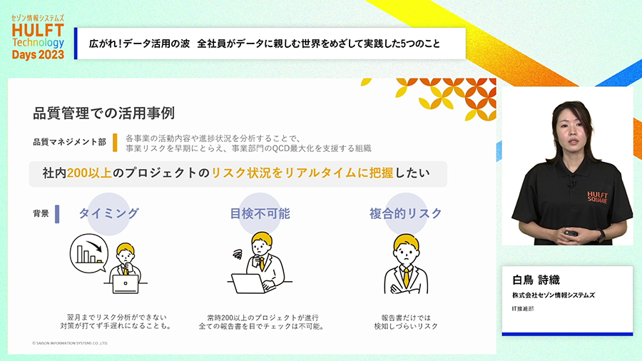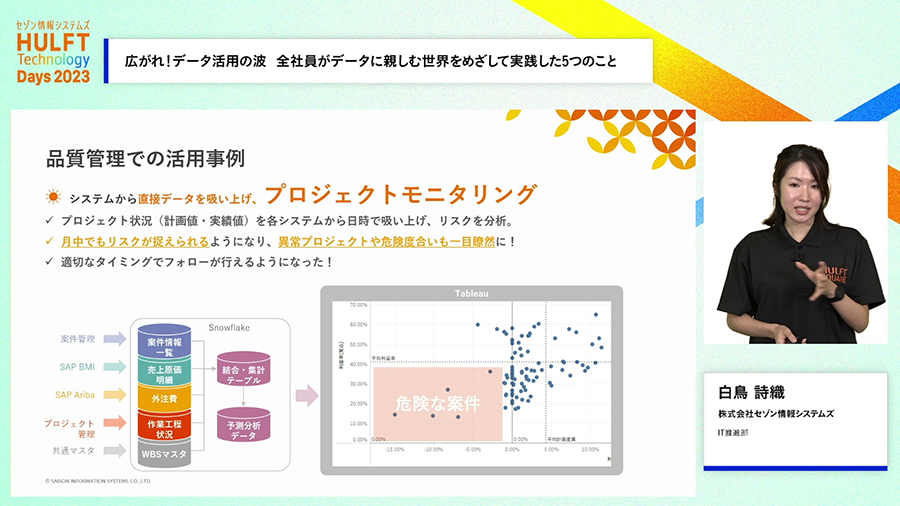 データ活用が定着してきたことにより、社内事例も多くできています。プロジェクト管理において、プロジェクトの状況をリアルタイムで二変数に集約して平面上にプロットすることで、外れ値のものや要注意領域にあるプロジェクトに気を配れるようになりました。従来においては集計作業だけで時間がかかったので、プロジェクトが終了してから問題があったことに気がつくなど事前の打ち手が難しかったのですが、そのような状況が改善されました。