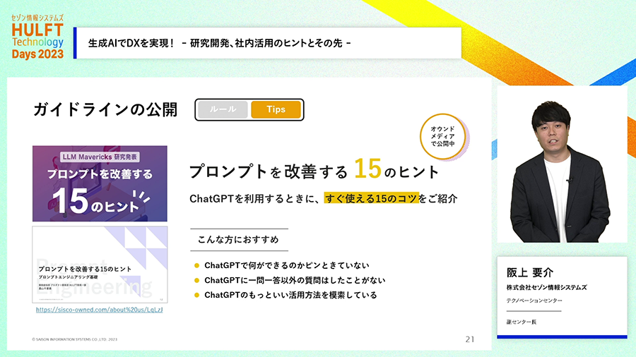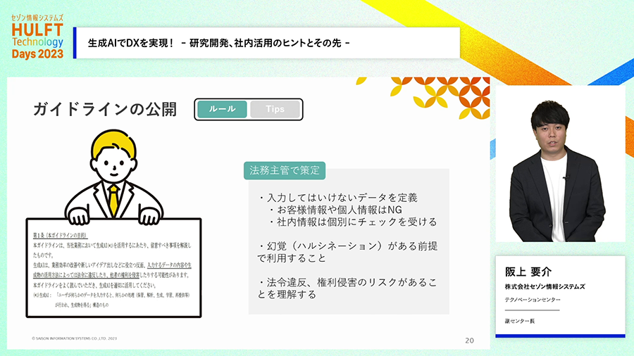 利用にあたっては、入力してはいけないデータがあることや、ハルシネーションがあり得るので間違った情報が入り込む可能性を踏まえた上での利用としてもらうガイドラインの公開と周知を行っています。およびプロンプトをどのように書いたらいいかの社内ガイドブックも作成しました。
