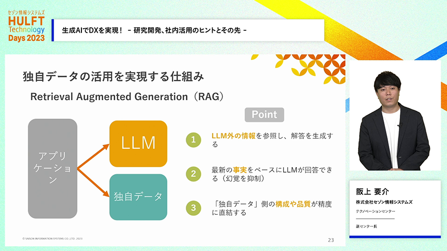 また、自分たちが蓄積したデータを生成AIに参照させて回答させる取り組みも行っており、世間的にRAG(Retrieval-Augmented Generation)と呼ばれている外部データを参照させる仕組みを実装しています。