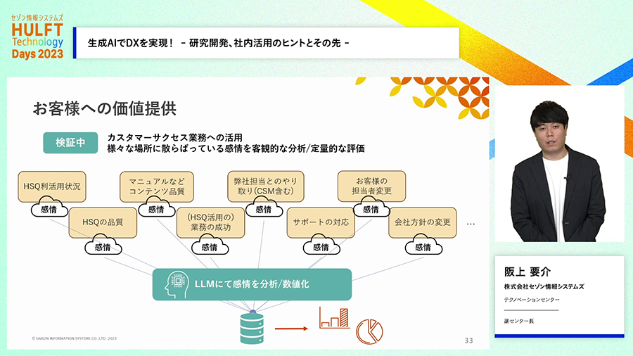 このような社内で利用している生成AIの利用基盤の構築サービスを、社外に提供する取り組みも始めています。例えば、Slackを通じて全社で生成AIが利用できる仕組みを構築するサービス、顧客から寄せられた声のテキストデータを生成AIに感情分析させてその結果を得られる仕組みについても、外部への提供に取り組んでいるところです。