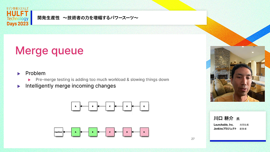 多人数で行われる開発では、いろいろな人がそれぞれ別に書いた変更差分を製品のソースコードに反映(マージ)しないと開発作業が製品に反映された状態になりません。しかも、変更差分にはきちんと作業できているものと、作業に間違いがあって不具合などがあるものや他の人の変更作業と衝突してうまく動かないものもあり、選り分けて受け入れる必要があります。押し寄せてくる多数の変更差分を、効率的にさばく方法が必要になります。