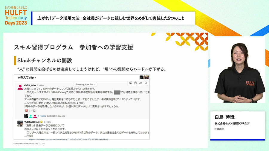 データ活用のスキルを身につけるためのトレーニングプログラムの整備にも力を入れており、データ活用で解らないことを気軽に聞ける環境の整備にも取り組んでいます。